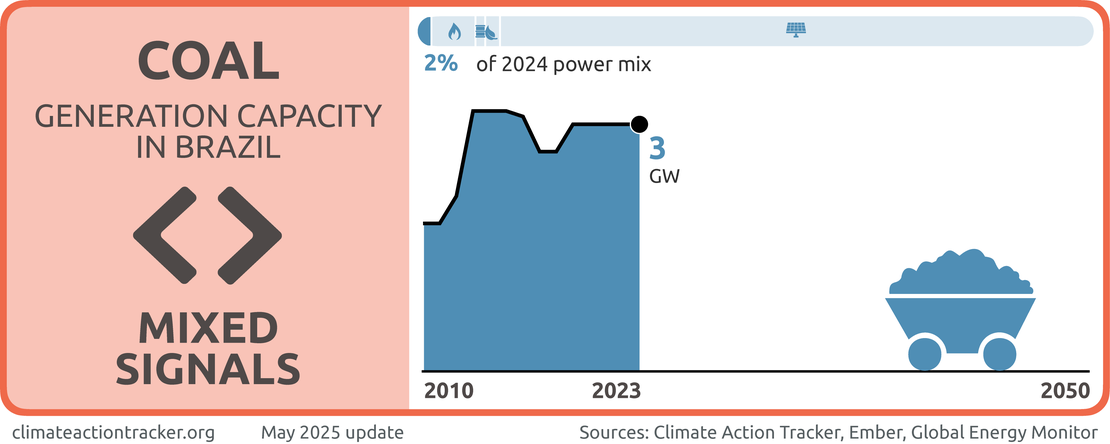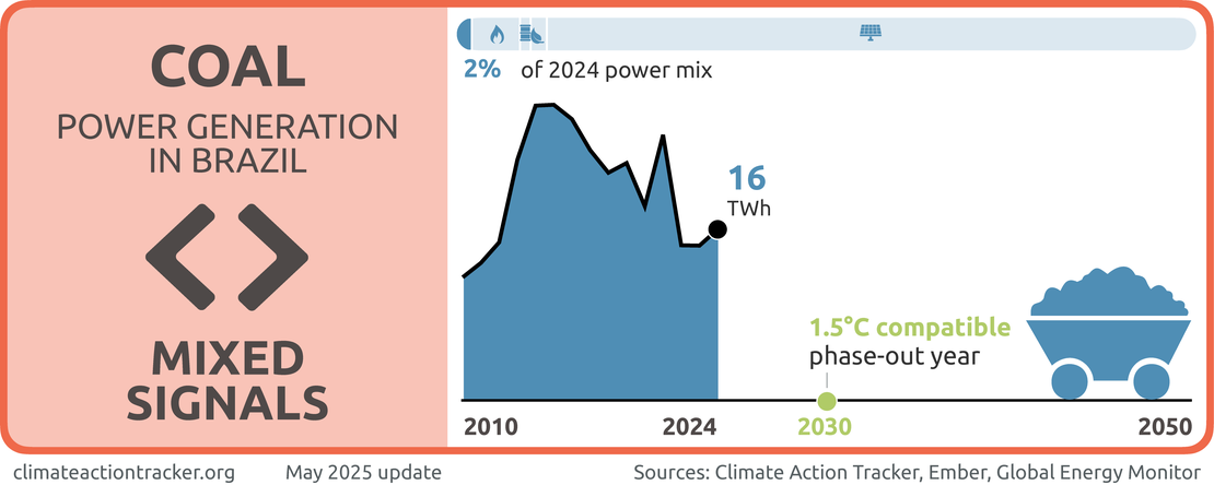 Coal represented 2% of Brazil's electricity generation in 2024 and it’s share has been decreasing over the last five years at a rate of about 0.3% per year. Despite its small and decreasing share in the power mix, we evaluate progress in this sector as sending "Mixed signals" given Brazil actually plans to expand coal capacity in the near future, does not yet have a coal phase-out target and has not adopted COP26's initiative to transition away from unabated coal power and to cease building new plants. To be 1.5°C compatible, Brazil would need to phase out coal in power generation by 2030.