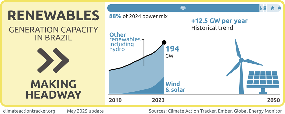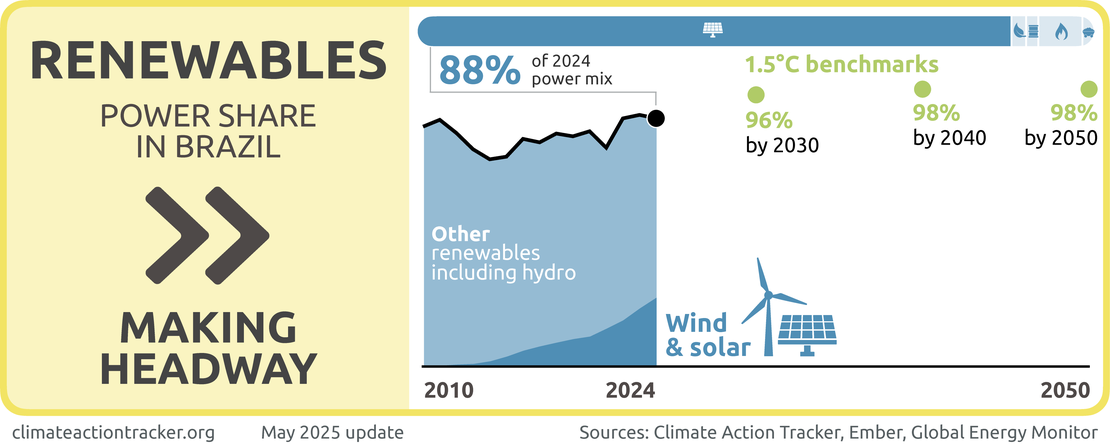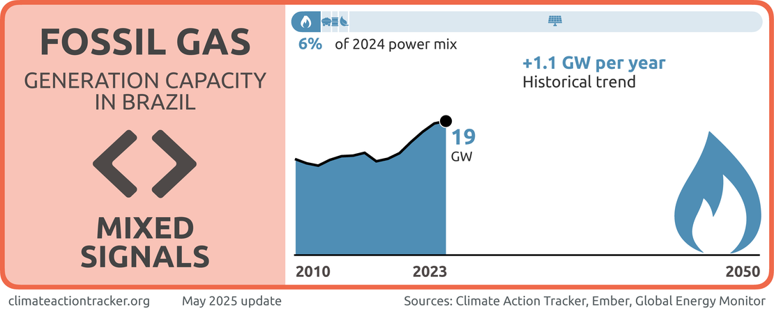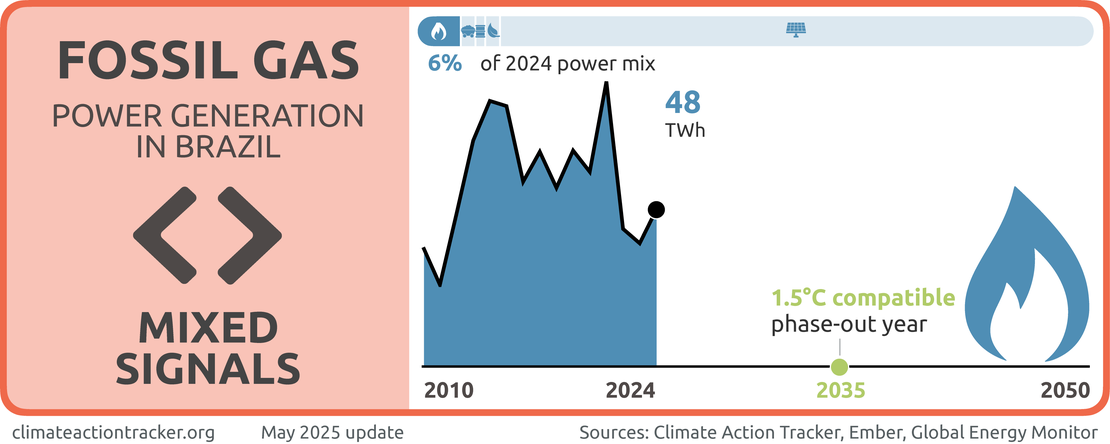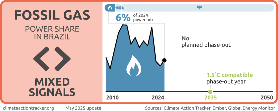 Expanding fossil-based generation risks Brazil losing out on its considerable potential for renewable power generation, and is not compatible with 1.5°C. To be 1.5°C compatible, Brazil would need to phase out fossil gas from power generation by 2035 but to date, Brazil does not have a fossil gas phase-out target (Climate Action Tracker, 2023).