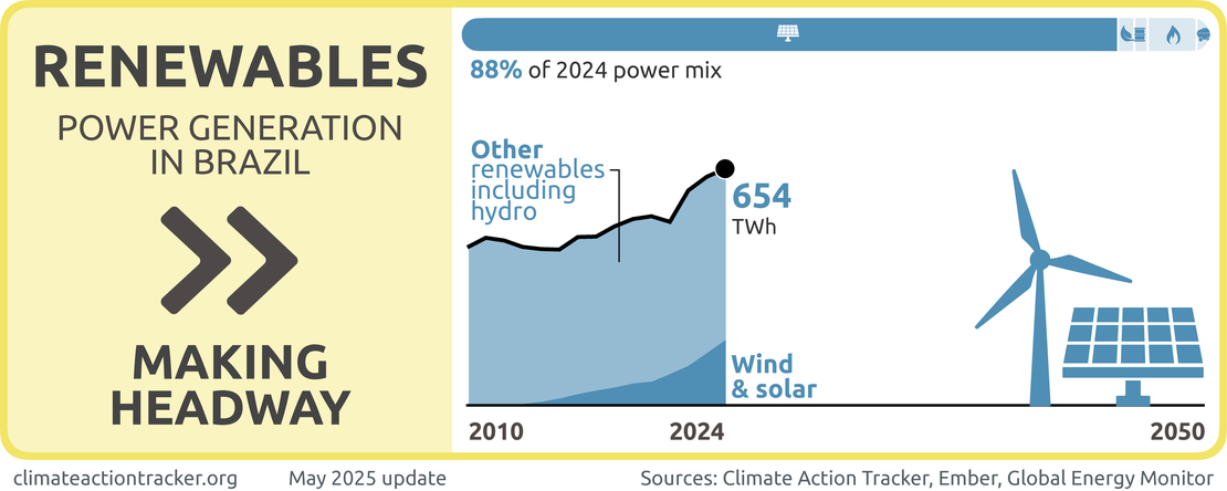 Brazil’s power sector is dominated by renewables which represented almost 90% in 2024 making Brazil’s power grid one of the world's cleanest. Though the high share of renewables is primarily due to hydroelectricity in the system, Brazil has significantly ramped up wind and solar deployment in the last five resulting in an increase in the share of wind and solar in power generation from about 11% to 25%. Fossil gas, coal, oil and nuclear make up the remaining 10% of electricity generation. The historical reliance on hydropower has exposed vulnerabilities as Brazil faced historic droughts that have led to decreased hydro power generation but instead of planning to replace this with other renewable sources, the government plans to also increase fossil fuel use (Ministry of Mines and Energy, 2022; Talanoa, 2023).