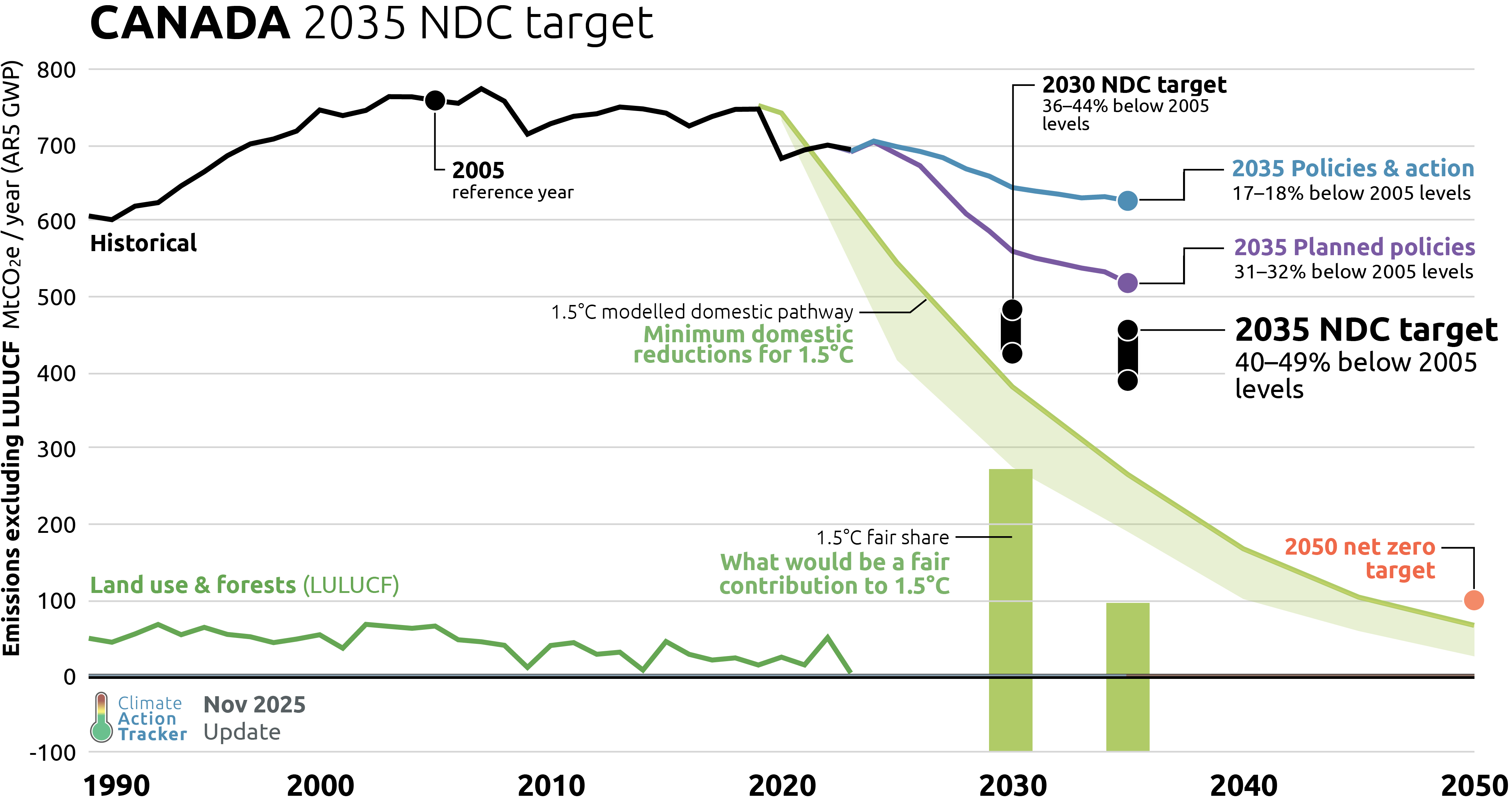 When excluding Canada's projected contribution of LULUCF, we estimate that Canada's 2035 target is even less ambitious at 40–49% below 2005 levels, or 388–455 MtCO2e. This is not 1.5°C compatible compared to modelled domestic pathways.