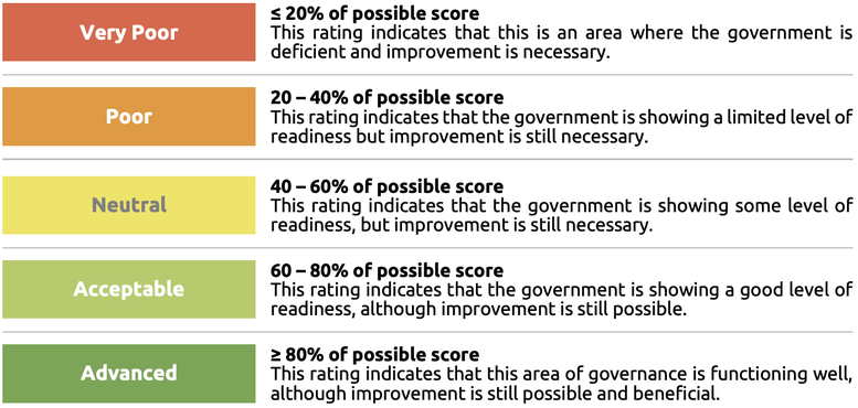 We analyse a number of different criteria of governance under four categories that cover the key enabling factors for effective climate action. We give each a rating as outlined above (very poor - poor - neutral - acceptable - advanced). For more detail on our methodology, click the link below.
