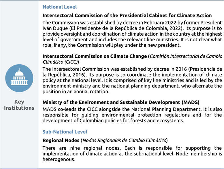 This report is focused on Colombia’s national climate governance. It does not cover governance matters related to fighting deforestation, though this will be a core element of Colombia’s climate action.