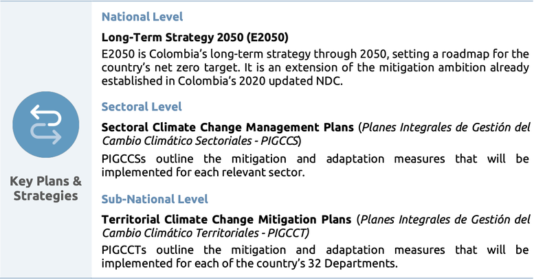 Colombia needs to work on mainstreaming climate considerations across all sectors. While the policy landscape is generally coherent, with the National Development Plan (a four-year plan adopted at the beginning of each new administration) driving broad sectoral objectives, there are many sectoral planning documents and these are not always up to date. Energy is the only sector to have updated its climate plan to align with the country’s 2050 strategy, and while the industry sector’s plan includes updated NDC measures, the others are based on the first NDC. The transport sector has not yet published its plan.