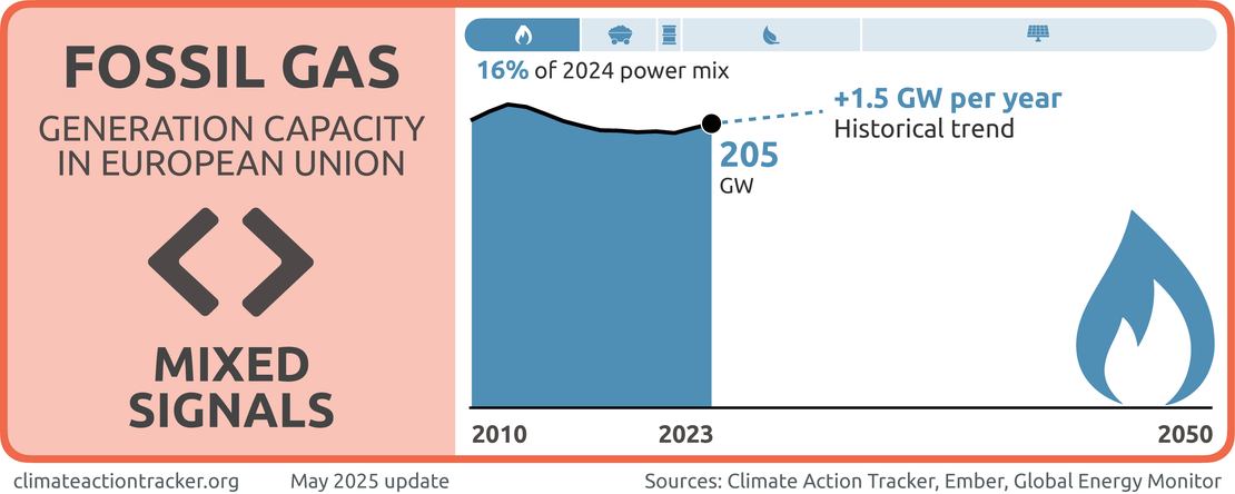 While the amount of electricity generated by fossil gas dropped in the last five years, it still makes up a sizable portion of the overall power mix at nearly 16% in 2024. At the same time, fossil gas generation capacity has grown. Like coal, the share of fossil gas in the overall power mix has decreased minimally over the last five years at just over 1% per year. Instead of setting a fossil gas phase-out date, the EU continues to invest in the buildout of LNG terminals and gas pipelines. We evaluate the EU’s progress on gas as sending “Mixed signals.”