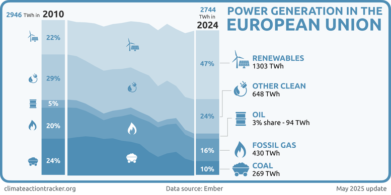 Nuclear power generated 24% of electricity in 2024 which the CAT does not see as a viable long-term solution to the climate crisis. The EU included nuclear energy in the Net-Zero Industry Act (NZIA), recognising it as a "strategic" technology. The NZIA supports nuclear technologies like small modular reactors, highlighting their potential to provide low-carbon energy with minimal waste, crucial for decarbonisation and energy security (European Commission, 2023d). In its 2040 climate target communication, the Commission did not specify any target or actions towards nuclear capacity build up but reaffirms nuclear a low carbon fuel needed to achieve its targets.