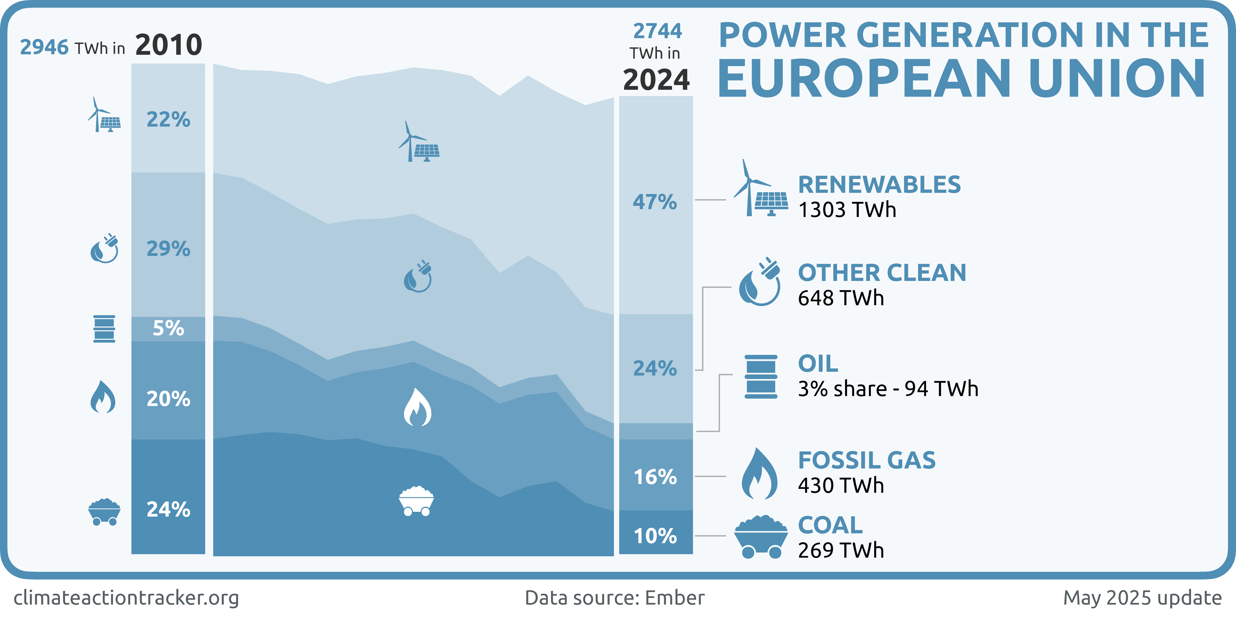 The EU has a binding renewable energy target of 42.5% and an indicative target of 45% by 2030 across all sectors set by the revised Renewable Energy Directive. Under the REPowerEU package, the Commission has indicated that the EU would need to achieve 69% of renewable energy in power generation to achieve this overarching renewable target of 42.5% – 45%. Member states are expected to outline how they will achieve their share of this target in the updated NECPs which were due in June 2024. As of May 2025, 23 out of 27 member states have submitted their final updates.
