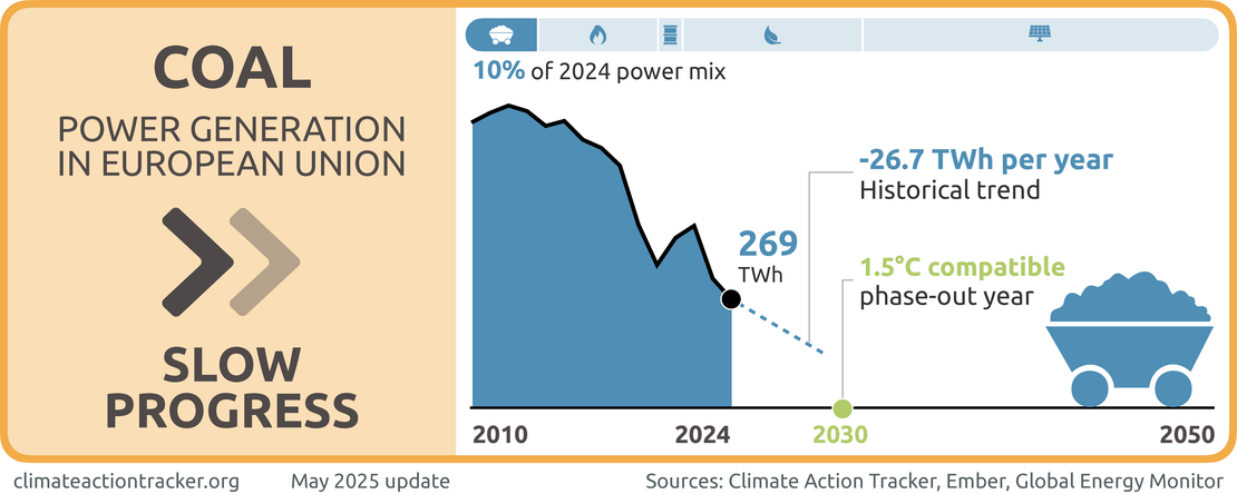 The EU’s share of coal in the power mix has decreased only marginally from 13% in 2020 to 10% in 2024. Despite this small share in the power mix and having signed up to the coal exit pledge at COP26, the EU has not committed to a coal phase-out date. Given the slow decrease of coal in the power and the lack of a phase out target, we evaluate the EU as making "Slow progress" on phasing out coal use in the power sector.
