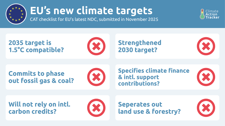 Just in time for COP30, the European Union submitted a 2035 NDC target aiming to reduce emissions by 66.25%–72.5% below 1990 levels (incl. LULUCF). This 2035 target range is neither 1.5˚C aligned nor does it meet the EU’s fair share to fight climate change. The less ambitious end of the target would see the EU reduce emissions between 2030-35 at a slower rate than what it has planned between now and 2030.