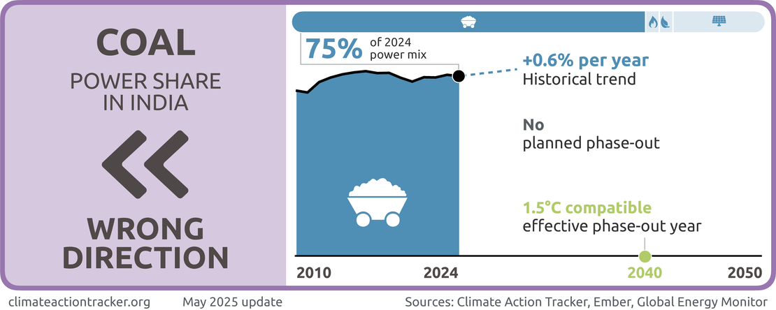 India’s electricity generation relies heavily on coal, representing over 75% of the country’s power mix. While the expansion of renewable energy has reduced coal’s share in installed capacity to below 50%, its contribution to actual generation remains high. Furthermore, almost 27 GW of new coal capacity is currently under construction and 92 GW in pre-construction (Global Energy Monitor, 2025b). Coal-based generation increased from 1295 TWh in 2023-2024 to 1332 TWh in 2024-25. This continued reliance on coal is clearly inconsistent with the 1.5°C temperature limit.