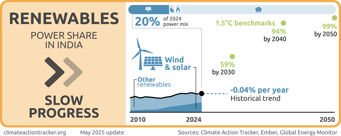 We evaluate India’s progress in renewables in the power sector as “Slow progress” (for detailed methodology on power sector evaluation please see here).