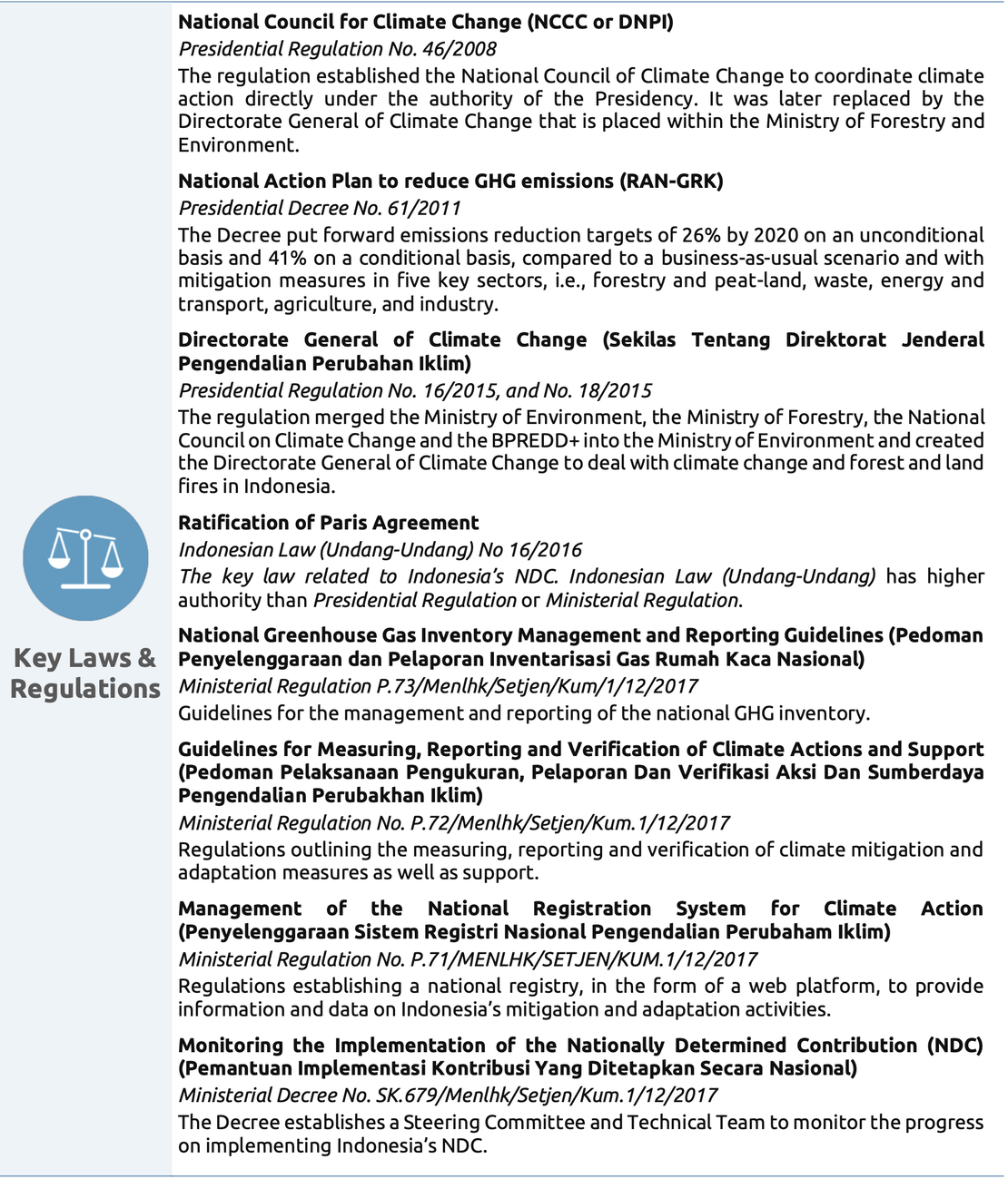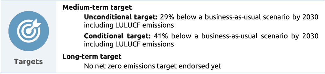 • Indonesia has put in place key climate legislation as early as 2007. It released an updated NDC but did not increase the ambition of its climate target, thus disregarding the ratchet-up mechanism of the Paris Agreement.