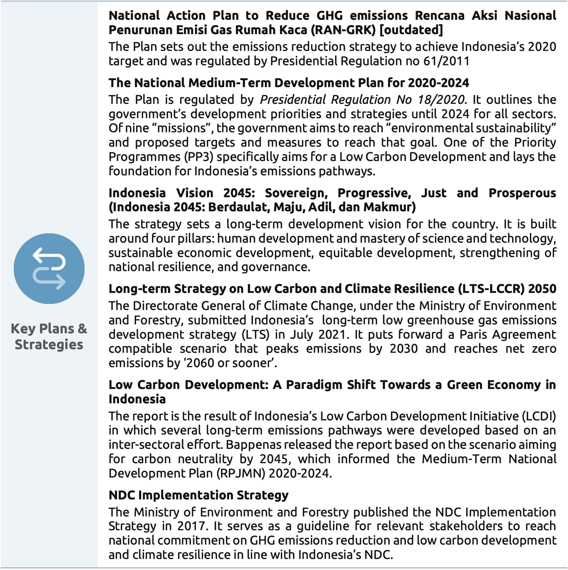 Indonesia’s national planning agency, Bappenas, coordinates planning and policy development amongst ministries as well as amongst provinces Notably, Bappenas has translated the national climate mitigation target into sector-level mid-term targets and policies collectively reaching an emissions reduction of more than 27%, and pursues the development of Regional Low-Carbon Development Plans (RPRKD).