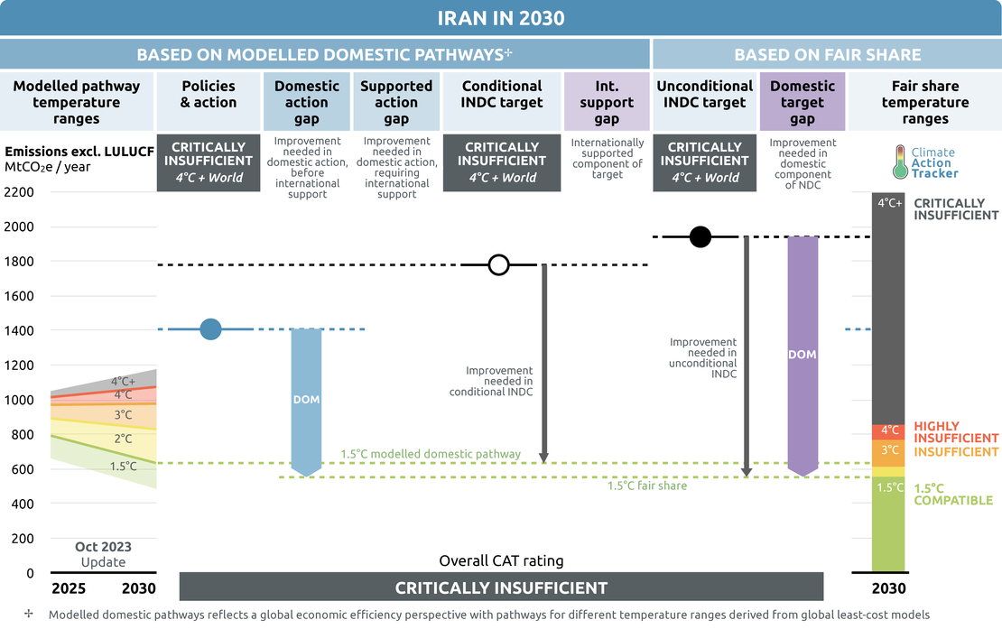 The “Critically insufficient” rating indicates that Iran’s policies and action in 2030 reflect minimal to no action and are not at all consistent with limiting warming to 1.5°C. If all countries were to follow Iran’s approach, warming would exceed 4°C.