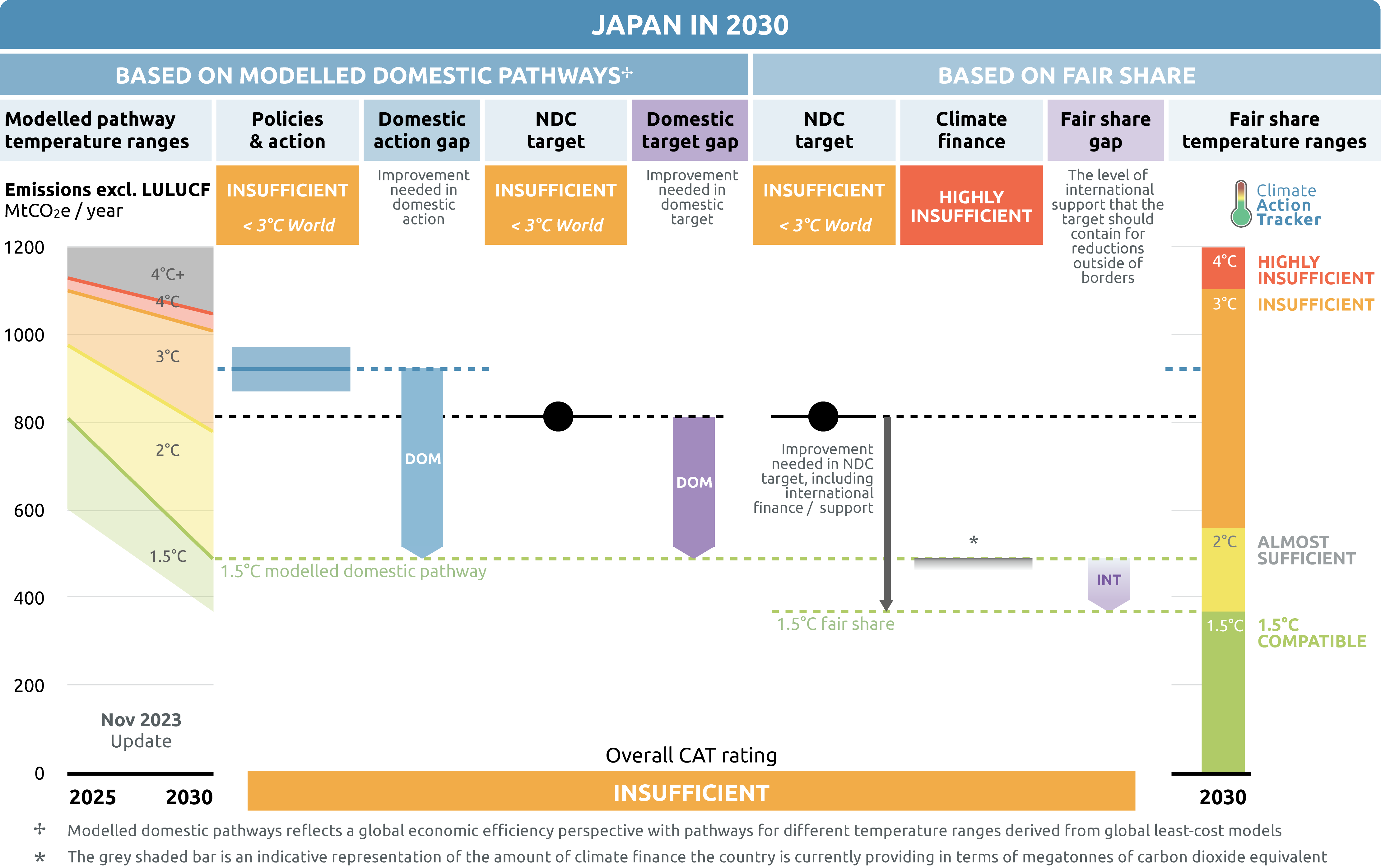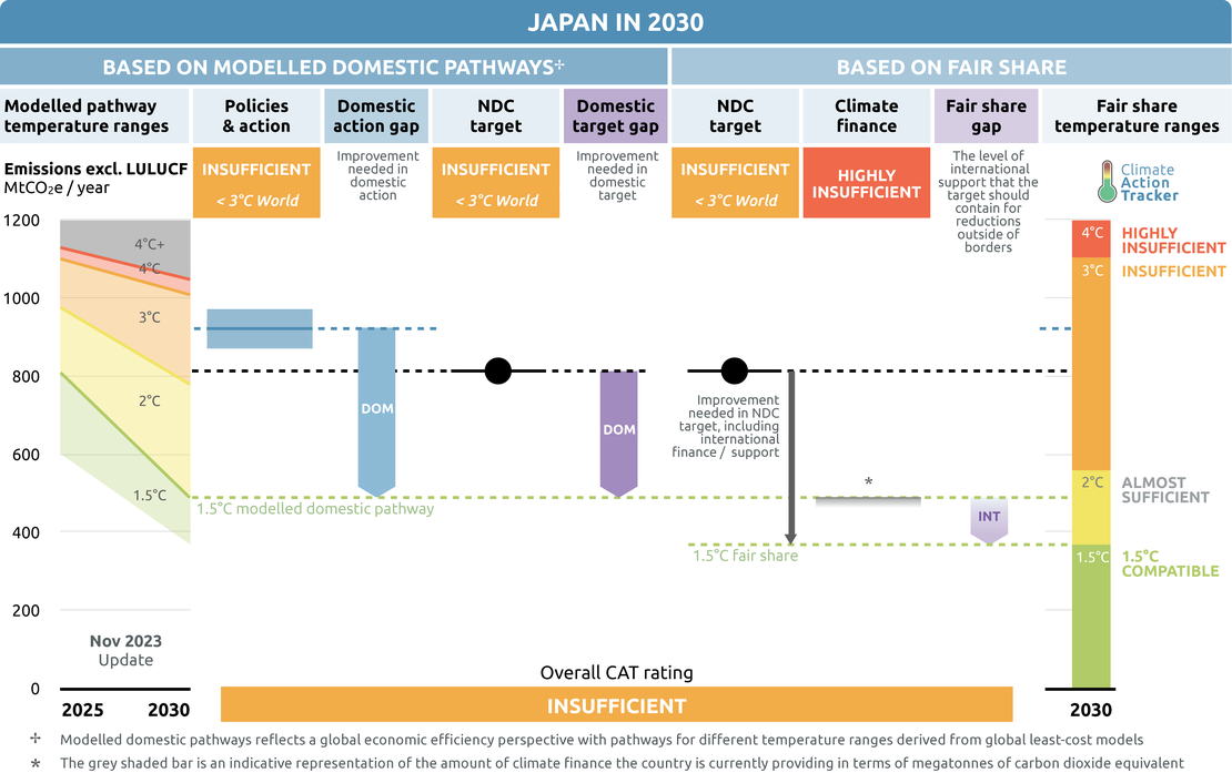 The CAT rates Japan’s policies and action against modelled domestic pathways as “Insufficient”. The “Insufficient” rating indicates that Japan’s NDC target against modelled domestic pathways needs substantial improvements to be consistent with limiting warming to 1.5°C. If all countries were to follow Japan’s approach, warming would reach over 2°C and up to 3°C.
