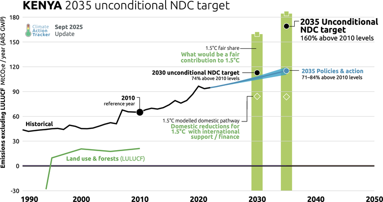 Kenya's new 2035 NDC commits to a 35% reduction in emissions by 2035 below business as usual (BAU) scenario. In absolute terms, emissions under this NDC would rise significantly, exceeding current policies. Kenya’s reliance on a BAU scenario target, coupled with the Kenian government’s stated right to revise it, raises concerns about accountability and transparency and risks undermining ambition if the baseline is adjusted upwards. The NDC does not commit to a fossil fuel phase-out and lacks clarity on the role of LULUCF. Kenya may consider selling emissions reductions under Article 6, which risks undermining ambition if the credits do not represent real, additional and permanent reductions.