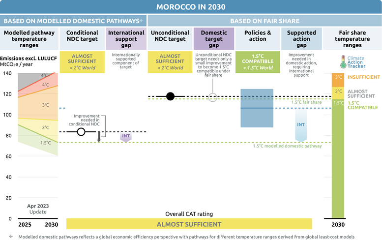 Morocco is on track to meet its unconditional target by 2030. However, it will only achieve its conditional target if all planned policies are implemented.