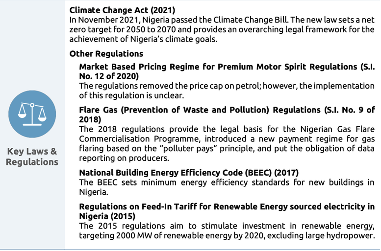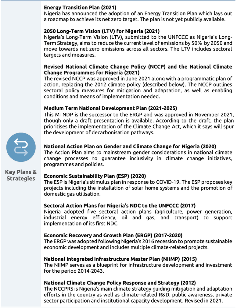 Nigeria’s policy processes have improved with the adoption of the Climate Change Act, though there is still scope for further enhancement. By setting into law a net zero target and establishing a five-year and annual carbon budget process, the Climate Change Act improves on the country’s near- and long-term planning. The government has also adopted its 2050 Long-Term Vision (LTV). The targets contained in the Act and Vision are not aligned, but further work to elaborate on the Vision is planned for 2022. Existing regulations outside the new climate law that address mitigation are fragmented and piecemeal.