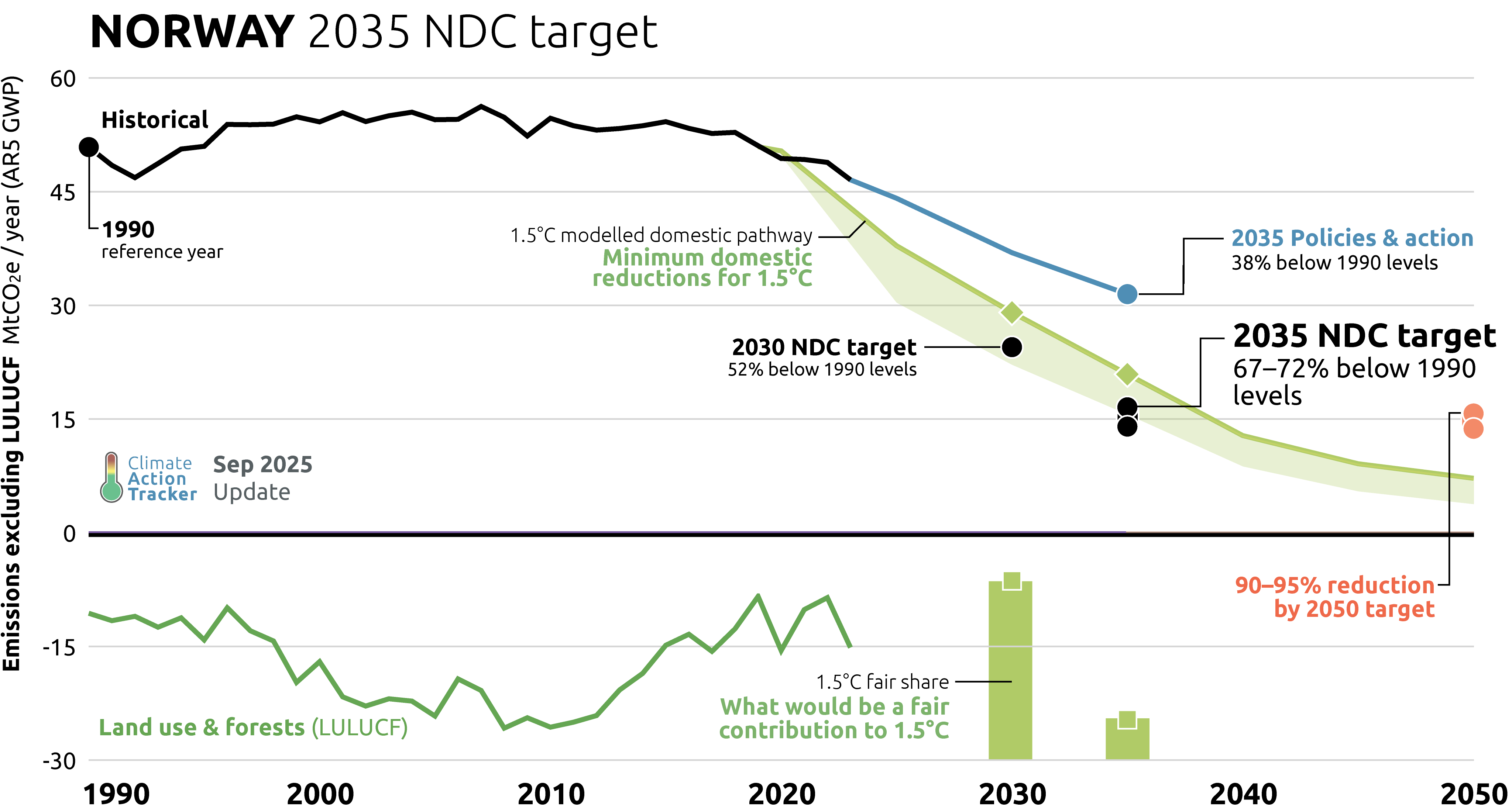 While Norway does not have a net zero target, instead aiming to reduce emissions by 90–95% by 2050, we consider Norway’s 2035 target to be aligned with this goal. The estimated emissions level in 2035 under this new NDC target is nearly the same as our estimate for Norway’s emissions level in 2050, meaning Norway is on track to meet its long term target 15 years early. Further information on Norway’s 2050 target can be found in the here.