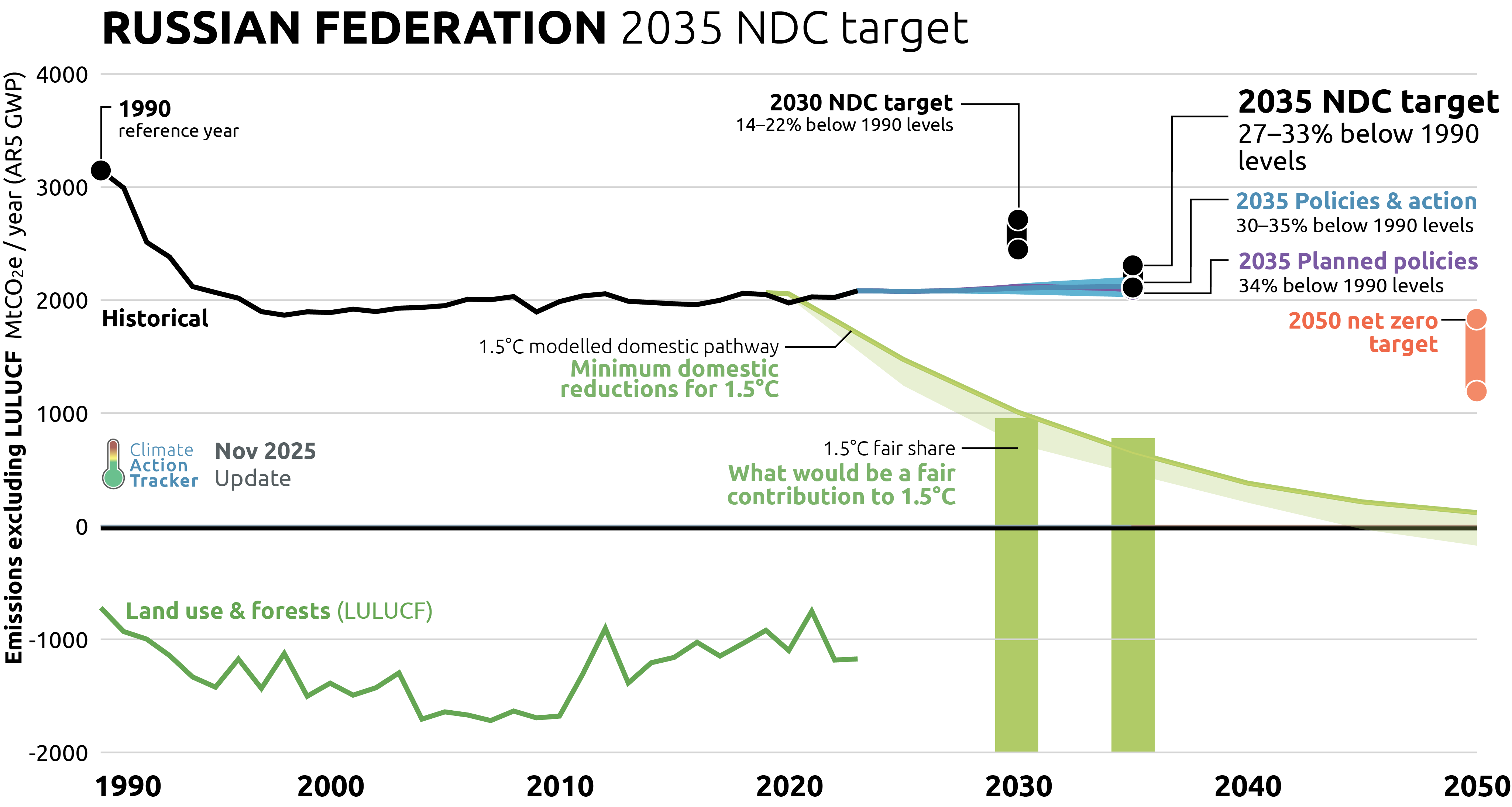 Russia submitted its 2035 NDC mitigation target on 29 September 2025, setting a target of limiting GHG emissions to 65–67% of 1990 levels by 2035. The target covers all sectors and all gases. The CAT excludes emissions from land use, land use change and forestry (LULUCF) from this target, resulting in an emissions level of 2,113–2,308 MtCO2e in 2035, or a 27–33% reduction below 1990 levels.