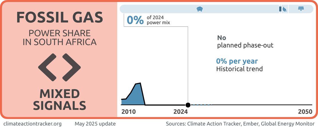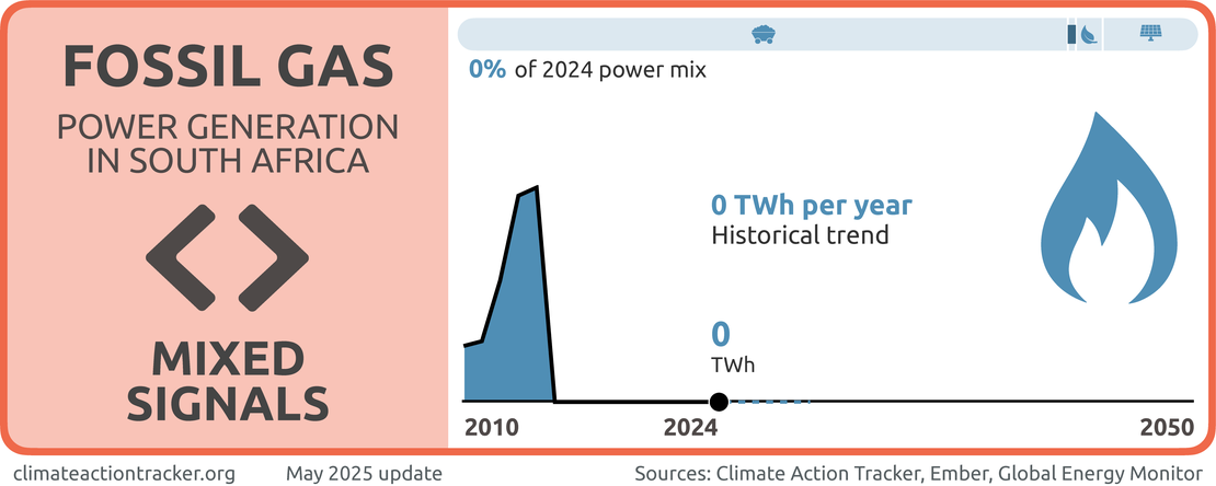 South Africa has begun implementing stated plans to increase fossil gas capacity, although progress is slow. In December 2023, the government issued a request for proposal for 2 GW of fossil gas power plant capacity. The bid window has since been extended to March 2025 following issues with the initial process, meaning additional gas capacity is yet to enter construction stage, as of early 2025 (Department of Mineral Resources and Energy, 2024a).
