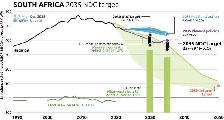 Note: South Africa does not set alternative conditional and unconditional targets. References are made to the expectation that international support will be provided, and South Africa has already received financial support under the JET-P programme. However, the NDC also commits to implementing domestic measures to achieve the targets. The CAT therefore considers the target range to be an unconditional commitment.