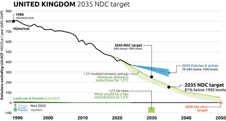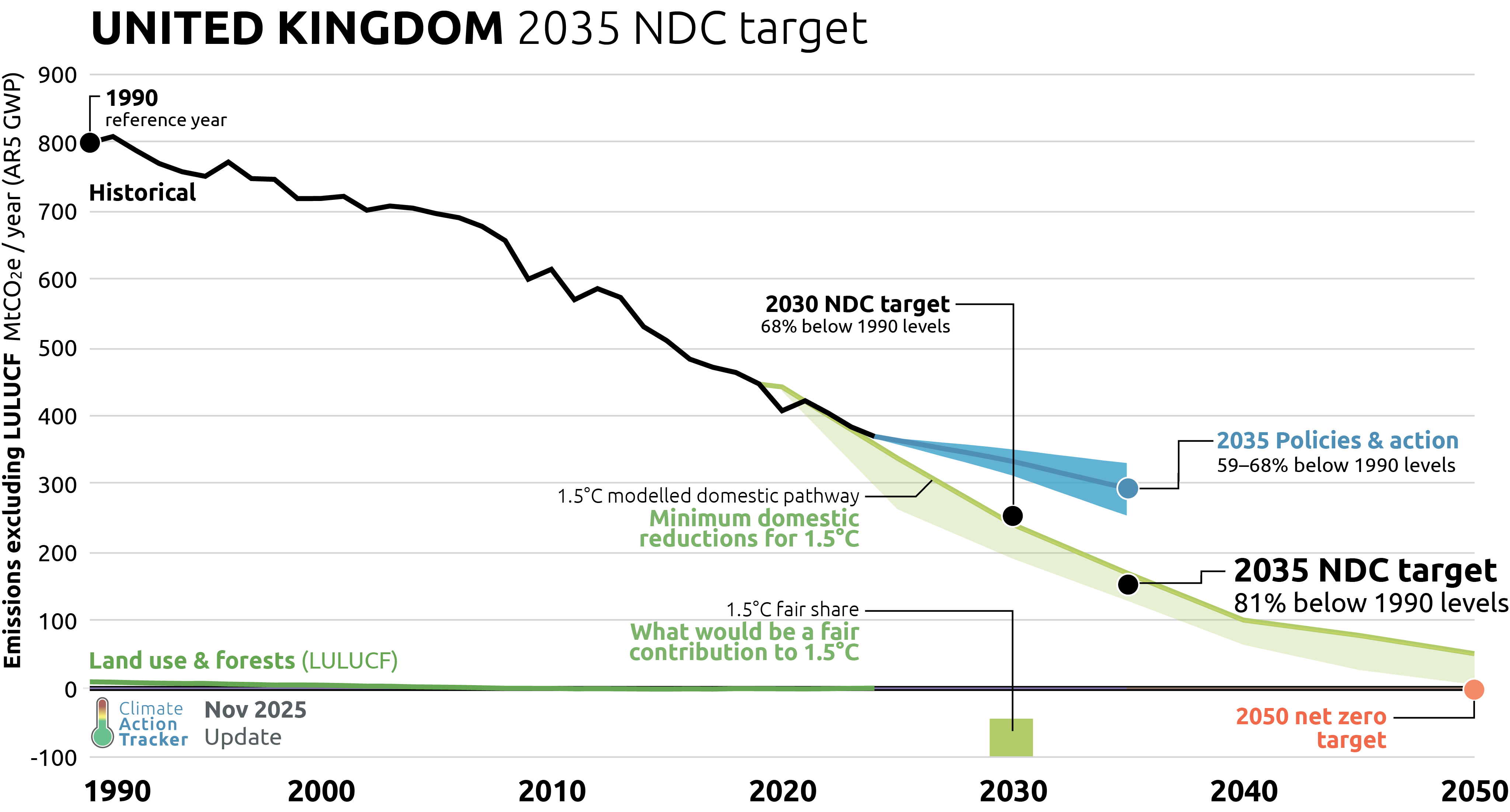 The UK submitted its 2035 NDC mitigation target on 30 January 2025 setting a target to cut emissions to 81% below 1990 levels by 2035, keeping the same headline ambition that it announced at COP29. This target covers all sectors and all gases. With its 2035 target of 153 MtCO2e, the UK has closed the gap between its target and our 1.5°C compatible MDP in 2035, going slightly below the threshold of 169 MtCO2e excluding emissions from land use, land use change and forestry (LULUCF).