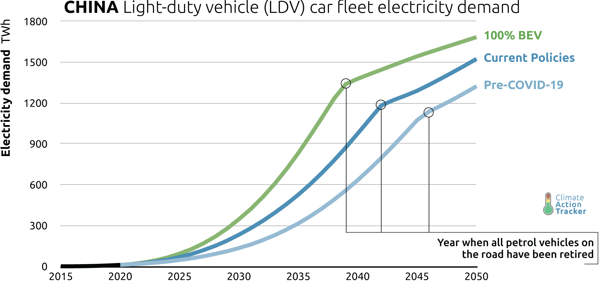 In our 100% Battery Electric Vehicles (BEV) scenario, which explores the implications of China reaching 100% BEV sales by 2035, emissions from passenger cars peak in 2026. It results in levels of 0 to 680 MtCO2/yr in 2050 which is a 13% to 100% reduction under the pre-COVID-19 scenario. Electricity demand reaches over 1,680 TWh/yr, which is roughly the current annual electricity consumption of both India and Germany combined.