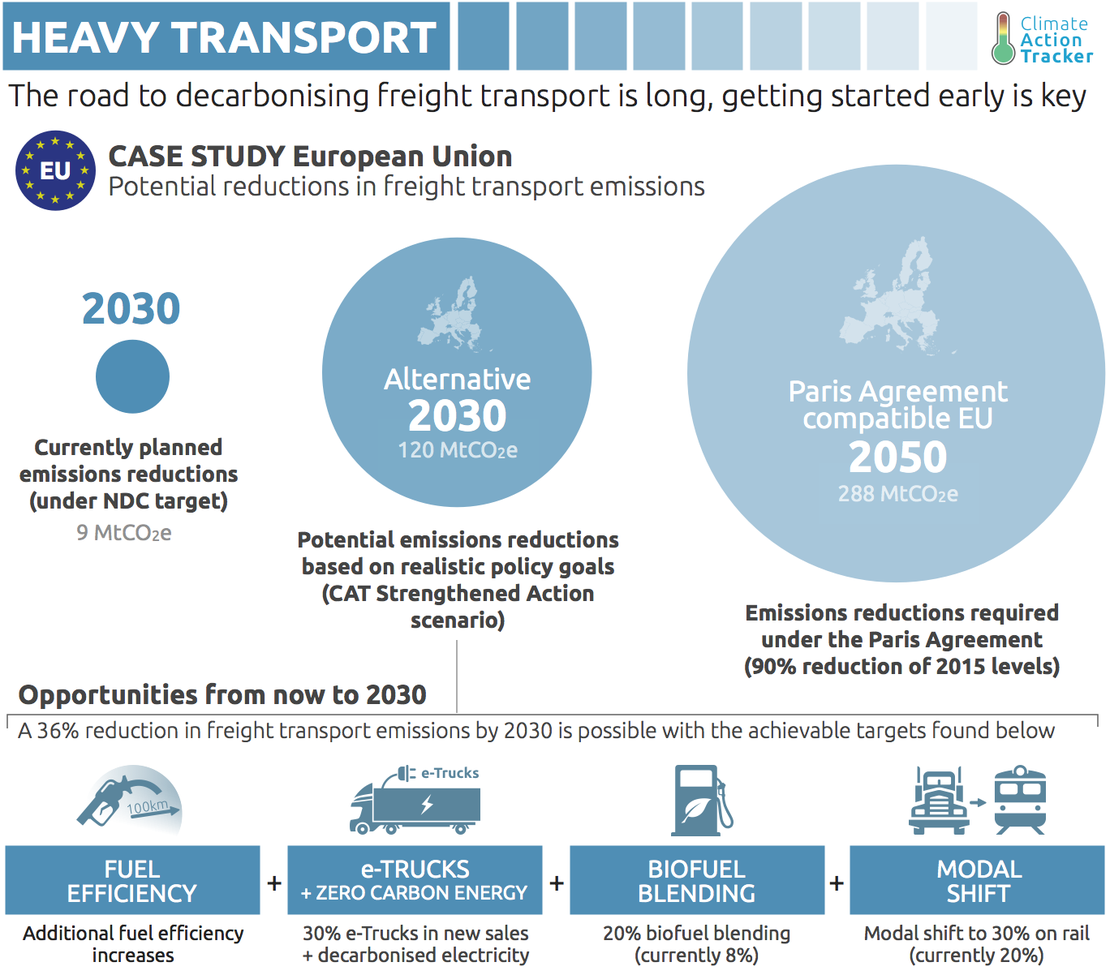 We find that heavy road emissions in the EU28 could be reduced by up to 90% below 2015 levels by mid-century. This could be achieved by a policy package of support for fast uptake of e-trucks (30% of new sales by 2030), combined with a 90% share of zero emissions electricity and short-term measures of introducing ambitious fuel efficiency standards for trucks, as well as incentives for shifting from road to rail and an increase in sustainable biofuel blending. To achieve this, existing EU policies must be strengthened and additional policies introduced. The recent EU Commission’s proposal—aiming at reducing the average CO2 emissions from new trucks by at least 30% by 2030 below 2019 levels—is a first step in the right direction although not yet in line with what is needed for the Paris Agreement.