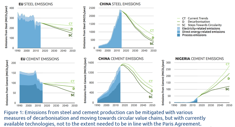 We looked at three different scenarios for both these industries, using country case studies for each. One follows current trends, one represents a shift towards decarbonisation of the energy supply, and one represents steps towards circular value chains. We also highlight the extent by which other step-change technologies can “close the gap” to net-zero emissions.