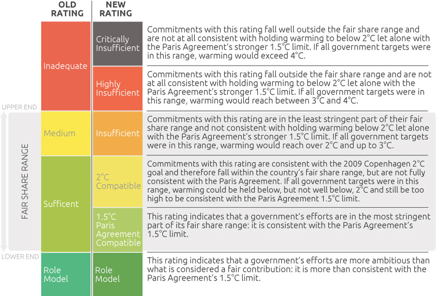 - The updated CAT rating system has six categories: “Role model,” “1.5°C Paris Agreementcompatible,” “2°C compatible,” “Insufficient,” “Highly insufficient,” and “Critically insufficient:”