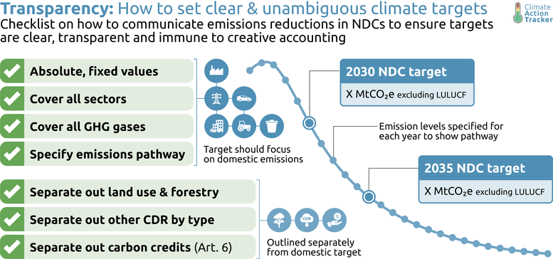 - NDC targets should primarily focus on their domestic reductions by decarbonising all sectors of the economy rather than relying on forestry sinks, other carbon dioxide removal (CDR) or carbon markets.