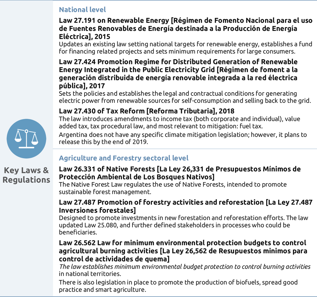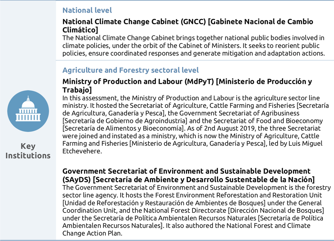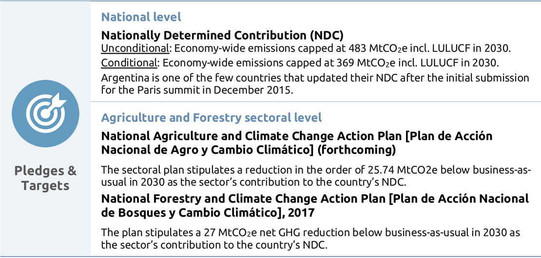These tables from the report give an overview and analysis of the key factors of Argentina's governance to enable effective climate action. We look at the country's key institutions, strategies, targets and legislation, as well at a sectoral level for the agriculture and forestry sector.