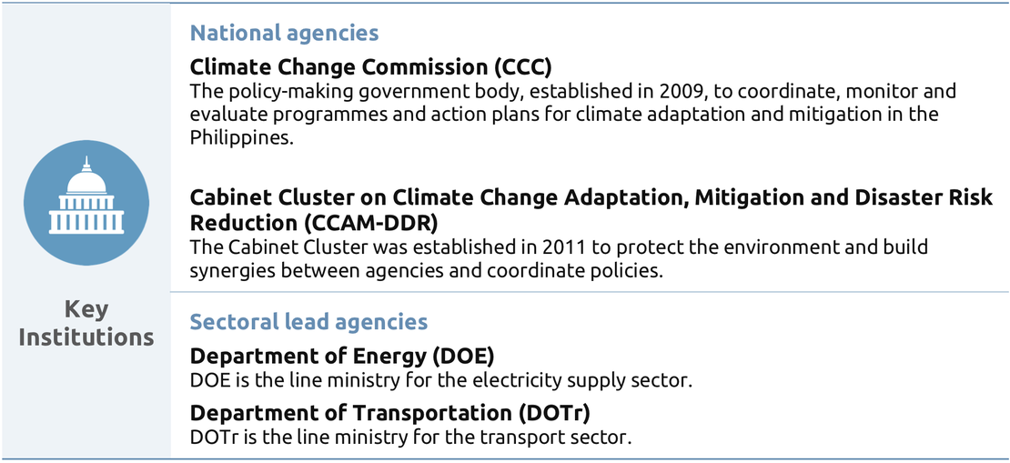 The Philippines has a dedicated agency - the Climate Change Commission (CCC) - and a high-level group within the executive tasked with climate mitigation. It exhibits a moderate level of effective coordination between government agencies and coverage across line ministries.