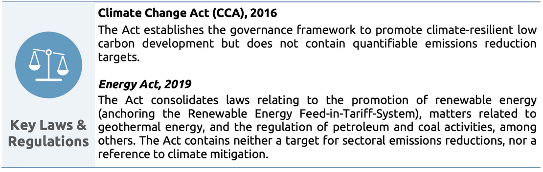 There have been no substantial developments in Kenyan climate governance since the publication of the National Climate Change Action Plan (NCCAP) 2018-2022, which was included in the CAT’s last assessment for Kenya. The government is still in the process of implementing the climate governance structures set out in the 2016 Climate Change Act. Further, the Kenyan Government plans to publish its updated NDC in the coming months, and has initiated the process of developing the country’s "2050 Long-Term Greenhouse Gas Strategy and Carbon Resilience Development Pathway under the Paris Agreement". The updated NDC and the Long-Term Strategy (LTS) will reveal whether the structural and institutional measures that have been established will result in adequate climate mitigation action. Similar to Kenya's 2030 Vision and the President's Big Four agenda, climate change or transition-related aspects are also not a priority in the country's economic stimulus program, which is intended to support vulnerable citizens and companies affected by COVID-19.1