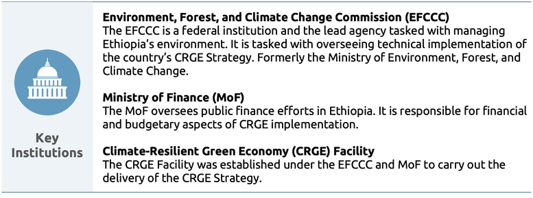 - Increase staffing and resources of the Environment, Forest and Climate Change Commission, Climate Resilient Green Economy units within ministries, and regional CRGE units to advance implementation of the climate strategy.