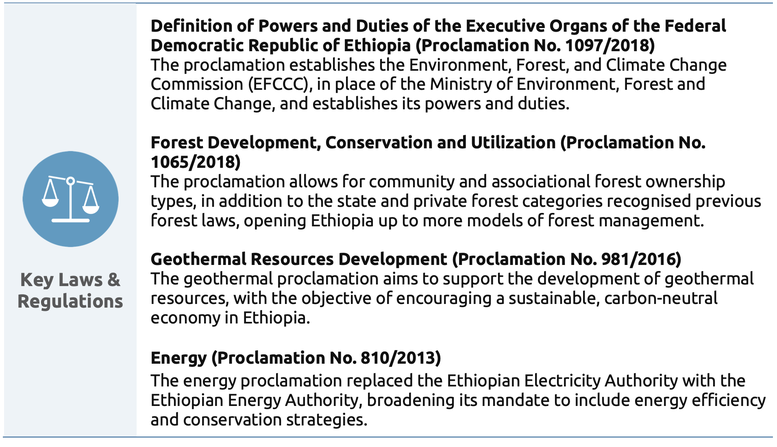 - Establish an explicit legislative mandate for relevant line ministry to reduce greenhouse gas emissions and ensure active engagement of all line ministries in the implementation of the Climate Resilient Green Economy (CRGE) Strategy and its successor.