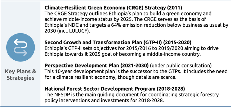 Many of Ethiopia’s processes for policy development, implementation and review are still under development. While climate mitigation has been considered in medium-term planning, with Ethiopia even adopting a 10-year climate strategy years before the Paris Agreement, long-term policy planning of national climate strategies is not fully developed. Ethiopia has not adopted an emissions reduction target for 2050, though it has set a long-term goal in its NDC to become carbon neutral. While the target date for carbon neutrality is undefined, this goal was an exceptional commitment from Ethiopia at the time it was made. Some progress has been made in developing a transparency framework; however, more work needs to be done for these to be operational and effective. Review and ratchet up mechanisms can also be strengthened.