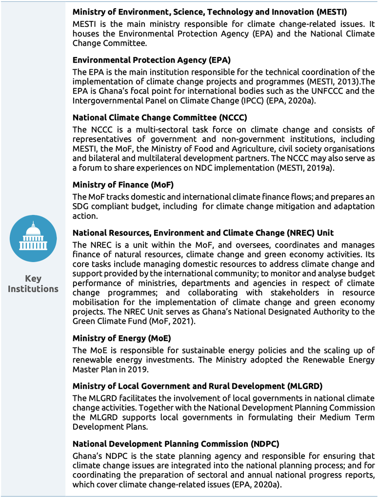 Structures for horizontal and vertical coordination on climate issues do exist but are not fully effective. While Ghana has the institutional structure in place to mobilise and manage climate finance, to date, the government has had difficulties in raising sufficient funds for climate action. The government institutions responsible for coordinating climate change action seem to receive sufficient budget to perform their statutory tasks, and their staff base seems stable. These institutions are therefore likely able to constantly build capacity and expertise.