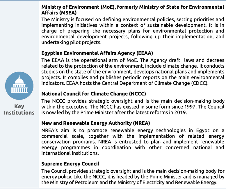 These tables from the report give an overview and analysis of the key factors of Egypt's governance to enable effective climate action. We have looked at the country's key institutions, strategies, targets and legislation.