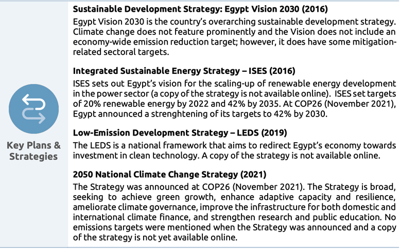 Mainstreaming the concept of a transition to a zero emissions society within government is in its infancy as Egypt has only recently begun to consider the need for such a transition. Egypt announced its 2050 National Climate Change Strategy (NCCS) in November 2021, though few details are available. Egypt’s numerous policies and strategy documents are generally aligned, though these are not transition focused and not updated frequently.