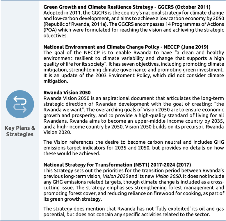 Rwanda has committed to net zero CO2 emissions by 2050, but has not yet defined a Paris Agreement- compatible decarbonisation pathway. That said, consideration of the long-term has long been part of its climate policy process. The country lacks comprehensive climate mitigation legislation and would benefit from updating its existing laws to include its emissions targets and governance provisions.