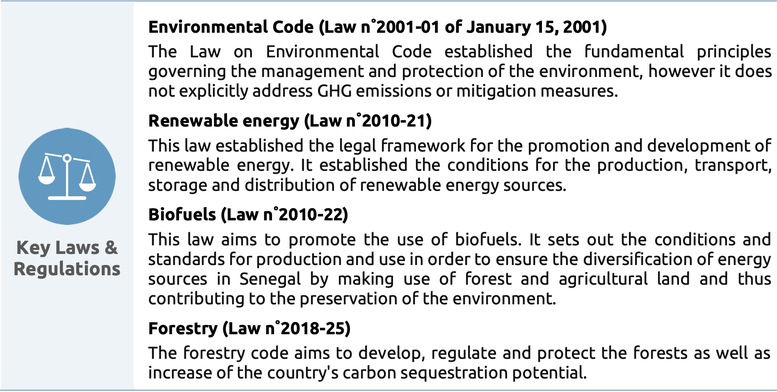 Senegal does not have comprehensive climate change legislation, though it does have some climate- relevant, sector-specific legislation. The country has not adopted a net zero target and some of its current plans, like shifting to fossil gas in its power sector, are inconsistent with a 1.5°C compatible pathway. The government did start to prepare its long-term low-carbon development strategy in March 2022. Hopefully, the long-term plan will help the country bring its short-term mitigation efforts into greater alignment with a decarbonisation pathway.