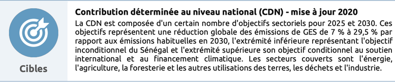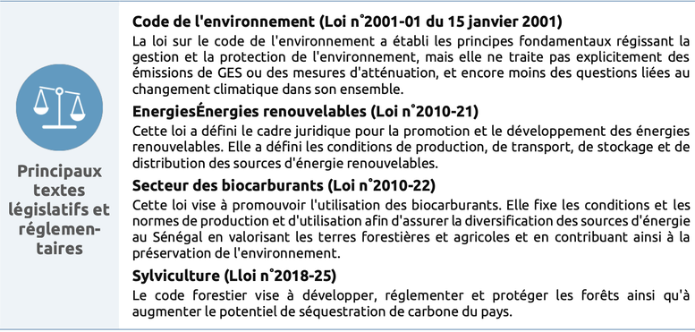 Le Sénégal ne dispose pas d'une législation complète sur le changement climatique, bien qu'il ait certaines législations sectorielles pertinentes sur le climat. Le pays n'a pas adopté d'objectif visant la neutralité carbone et certains de ses plans actuels, comme le passage au gaz fossile dans son secteur de l'électricité, sont incompatibles avec la voie de limitation de la température de la planète à 1,5°C. Le gouvernement a commencé à préparer sa stratégie de développement à long terme à faible intensité de carbone en mars 2022. Il est possible d’espérer que ce plan à long terme aidera le pays à mieux aligner ses efforts d'atténuation à court terme sur une voie de décarbonisation.