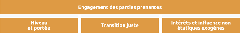 - Renforcer les efforts visant à assurer une transition juste pour tous en adoptant une stratégie globale et en s'attaquant aux problèmes de ceux qui sont affectés par les besoins de la transition.