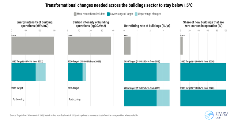 Buildings’ current levels of energy and carbon intensity must decline by 17%-41% and 58%-66%, respectively, by 2030. At the same time, annual retrofitting rates should increase by at least 150%-250% from recent levels to meet 2030 and 2035 targets, while today’s share of new buildings that are zero-carbon should grow by more than 1,000%.