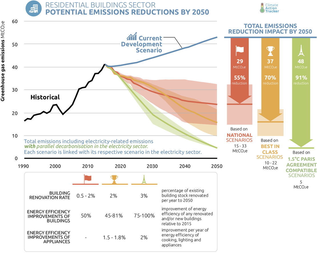 Measures in the residential buildings sector proposed by national researchers and other national stakeholders can already drive ambitious mitigation. Such proposed measures include increasing the thermal retrofit rates of existing buildings by 2% annually, with a 50% energy efficiency improvement by 2020 or a 90% market share of heat pumps of all heating appliance being sold by 2030. Such measures would closely align Argentina with action international frontrunner countries are implementing, and would bring Argentina close to a low-carbon transition of the residential housing sector if implemented.