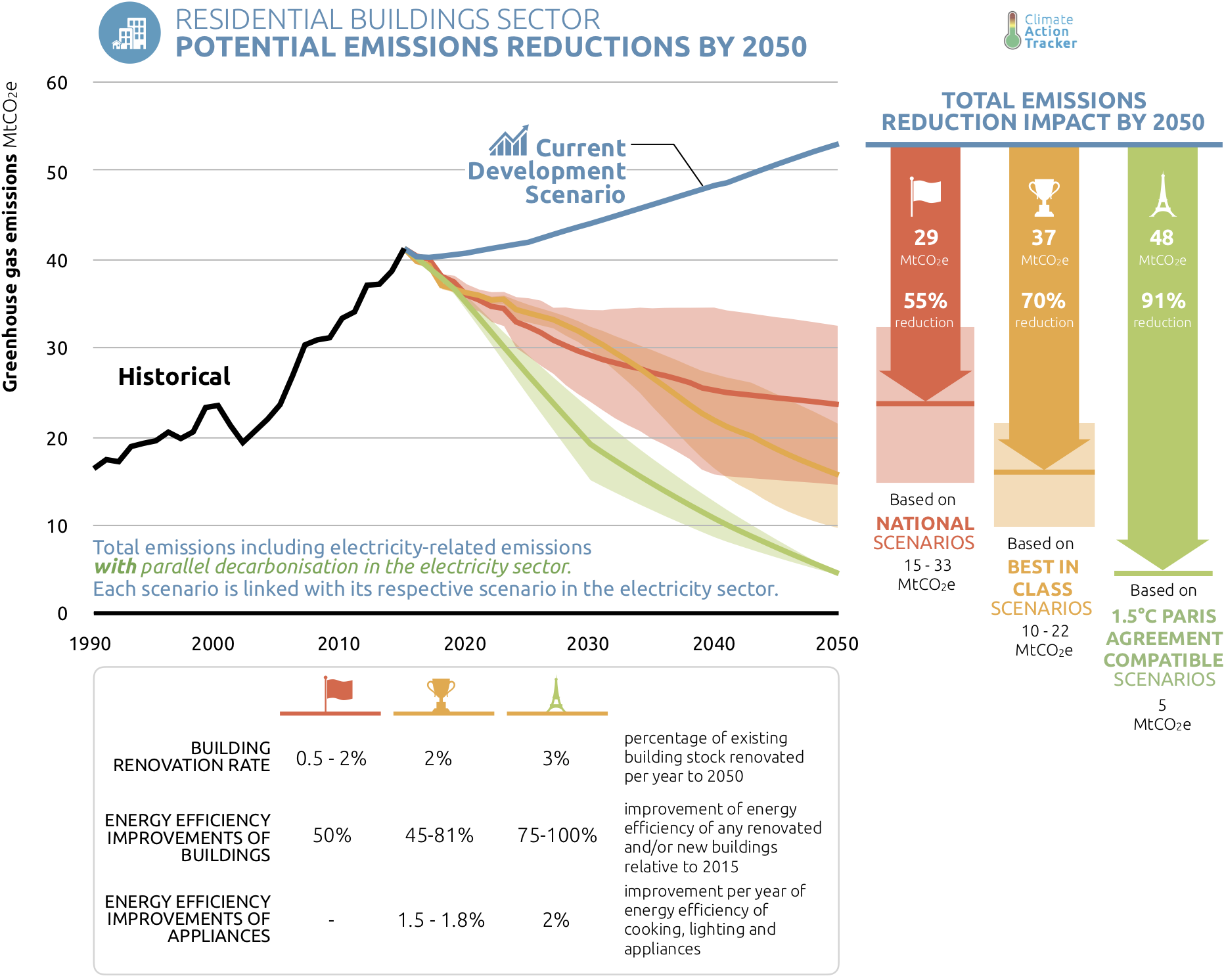 Even without any further climate action in the electricity supply sector beyond current levels, the above mentioned policies in Argentina’s residential buildings sector could still reduce emissions by up to 31% below today’s levels by 2050.