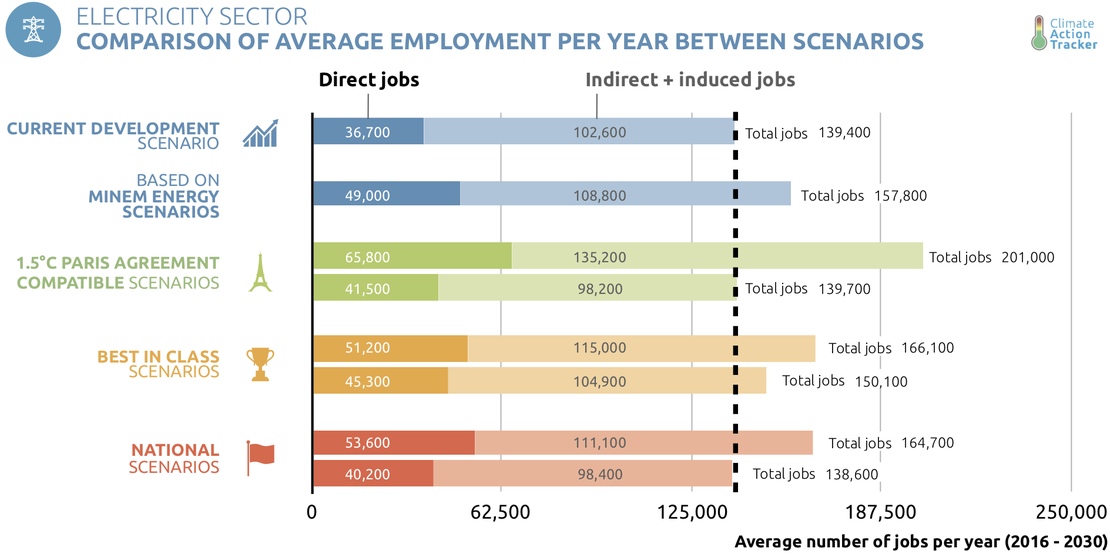 Under the Current Development Scenario, approximately 37,000 people a year, on average, are directly employed in developing new electricity supply capacity and operating and maintaining both existing and new capacity over the period of 2016–2030. We estimate these investments would stimulate a further 103,000 indirect and induced jobs a year, on average, such as jobs in cement production for the concrete foundations of wind turbines.