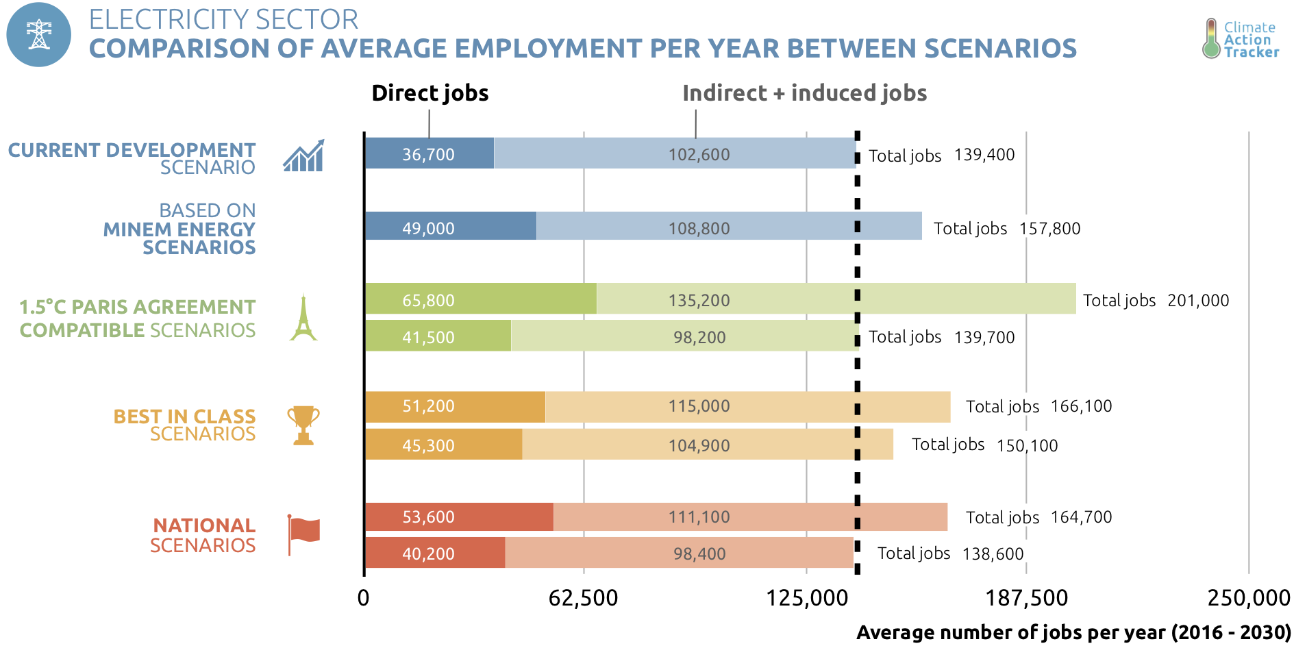 1.5°C Paris Agreement Compatible scenarios support up to 29,000 directs jobs per year more than Current Development Scenario. The estimated employment impact across all other scenarios all support at least as many jobs as the Current Development Scenario. They range between approximately 40–66,000 direct jobs a year and a further 98–135,000 jobs when considering the wider indirect and induced impacts of the investments.