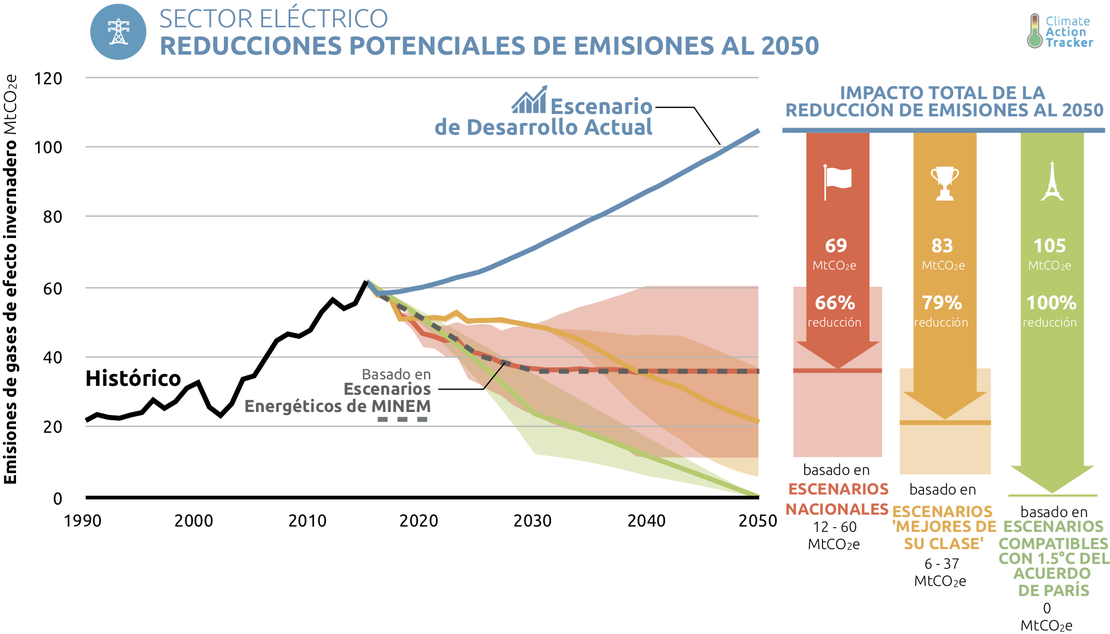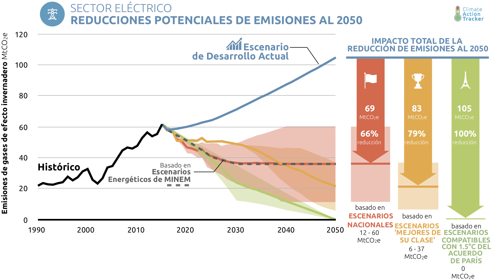 Las acciones en los tres sectores de interés identificadas en este pueden reducir las emisiones de GEI hasta un 94% por debajo de los niveles de 2014 en estas áreas para el año 2050 y a su vez reducir las emisiones totales un 7 % por debajo de los niveles de 2014 para el año 2050. Lo último es equivalente a un 38 % por debajo de un Escenario de Desarrollo Actual para 2050.